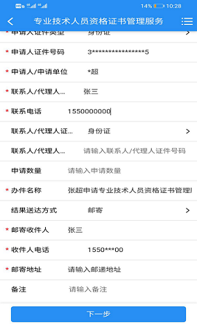 5.填寫收件人姓名、電話和郵寄地址后,點(diǎn)擊“下一步”(結(jié)果送達(dá)方式請選擇郵寄,備注中請注明領(lǐng)取何種專業(yè)技術(shù)資格證書。)