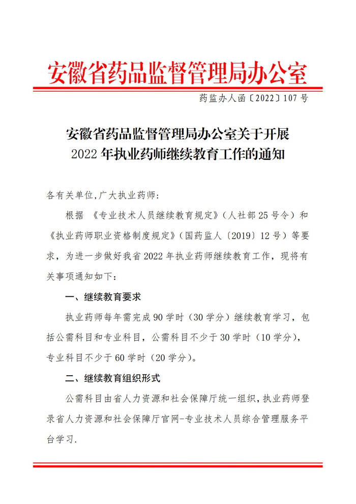 安徽省關(guān)于開(kāi)展2022年執(zhí)業(yè)藥師繼續(xù)教育工作的通知