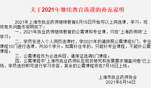 四、公需課程中“上海市執(zhí)業(yè)藥師隊(duì)伍現(xiàn)狀研究和發(fā)展需求調(diào)查問卷”已上線,學(xué)員選好即可進(jìn)行學(xué)習(xí)作答,其余的公需課程將在7月15日上線。