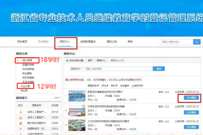 ①點(diǎn)擊“課程中心”, 選擇一般公需與行業(yè)公需課程,分別“點(diǎn)擊播放”。