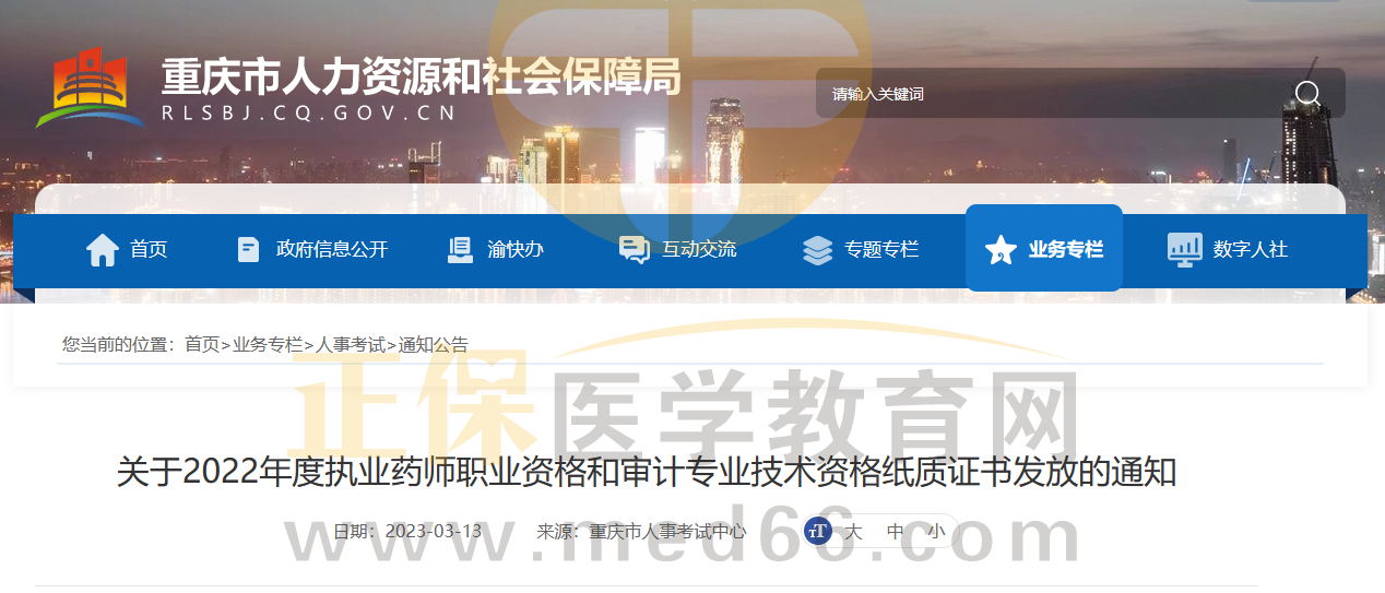 關(guān)于2022年度重慶執(zhí)業(yè)藥師職業(yè)資格和審計(jì)專業(yè)技術(shù)資格紙質(zhì)證書發(fā)放的通知