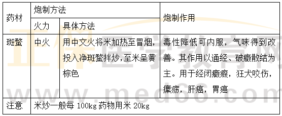 【答案解析】米炒斑蝥毒性降低,其氣味得到矯正,可內服。以通經、破癥散結為主。用于經閉癥瘕,狂犬咬傷,瘰疬,肝癌,胃癌。