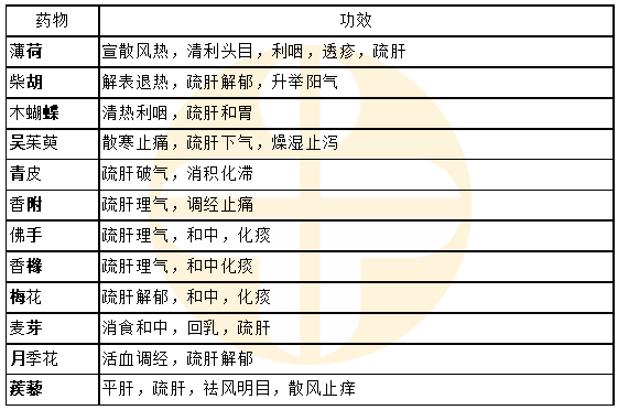 薄荷、柴胡、木蝴蝶、吳茱萸、青皮、香附、佛手、香櫞、梅花、月季花、蒺藜、麥芽[正保醫(yī)學(xué)教育網(wǎng)原創(chuàng)]。(12個)記憶技巧:岳父沒牙喝蒺藜,蝴蝶無緣親佛手。
