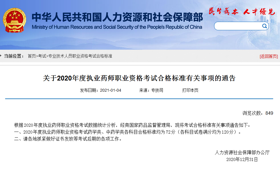 2021年1月4日公布2020年執(zhí)業(yè)藥師考試分?jǐn)?shù)線!