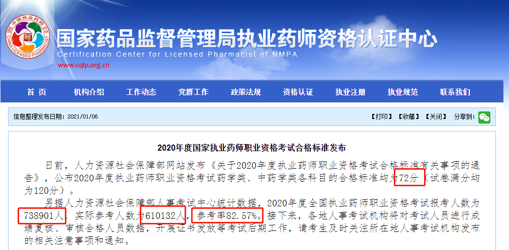 日前,人力資源社會(huì)保障部網(wǎng)站發(fā)布《關(guān)于2020年度執(zhí)業(yè)藥師職業(yè)資格考試合格標(biāo)準(zhǔn)有關(guān)事項(xiàng)的通告》,公布2020年度執(zhí)業(yè)藥師職業(yè)資格考試藥學(xué)類、中藥學(xué)類各科目的合格標(biāo)準(zhǔn)均為72分(試卷滿分均為120分)。