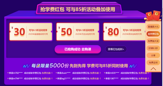 2019年12月9日-2019年12月12日(24:00)期間用戶可來(lái)頁(yè)面免費(fèi)領(lǐng)取學(xué)費(fèi)紅包(活動(dòng)期間內(nèi)用戶僅限領(lǐng)取一次),學(xué)費(fèi)紅包內(nèi)含30元、50元、80元優(yōu)惠券,使用規(guī)則如下: