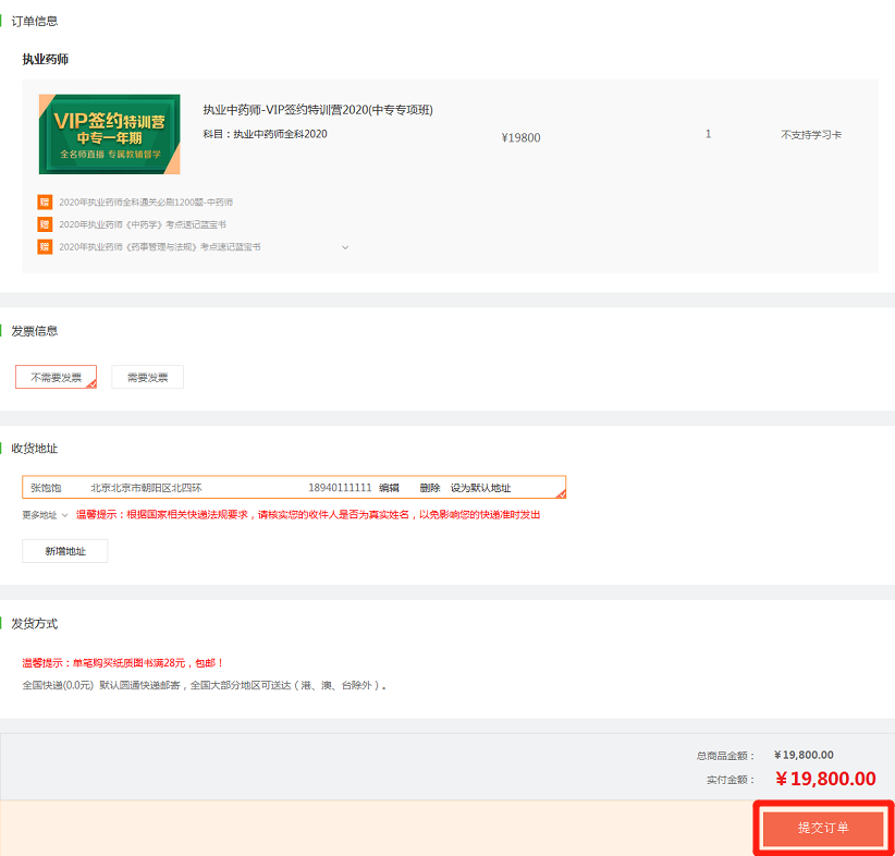 第二步:在訂單頁確認無誤后,點擊“提交訂單”;