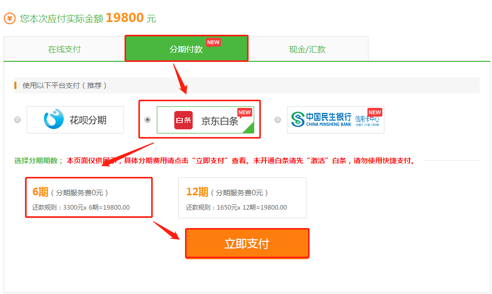 第三步:在支付頁面,選擇分期付款-京東白條進行支付!