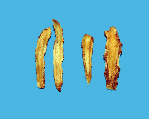略呈圓柱形,表面淺棕色至棕褐色,具縱皺紋及橫長皮孔樣突起。質(zhì)柔韌,斷面黃白色或淡棕黃色,皮部厚,有裂隙及多數(shù)棕色點狀分泌腔,木部色較淡,形成層環(huán)黃棕色。有濃郁的香氣,味甘、辛、微苦。