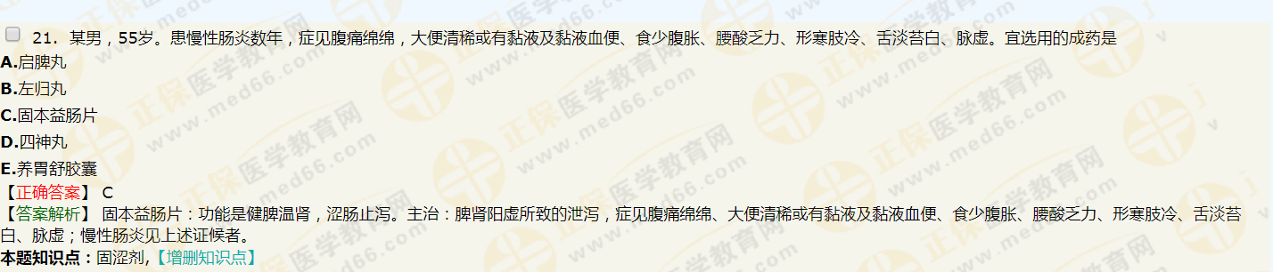 28.某男,45歲?;悸阅c炎5年,刻下腹痛綿、大便清稀,時有黏液血便、食少腹脹、腰酸乏力、形寒肢冷,舌淡苔白,脈虛,治當(dāng)健脾溫腎、澀腸止瀉,宜選用的成藥是(A)