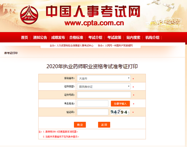 2020年執(zhí)業(yè)藥師準(zhǔn)考證打印官網(wǎng)入口:http://www.cpta.com.cn(中國人事考試網(wǎng))