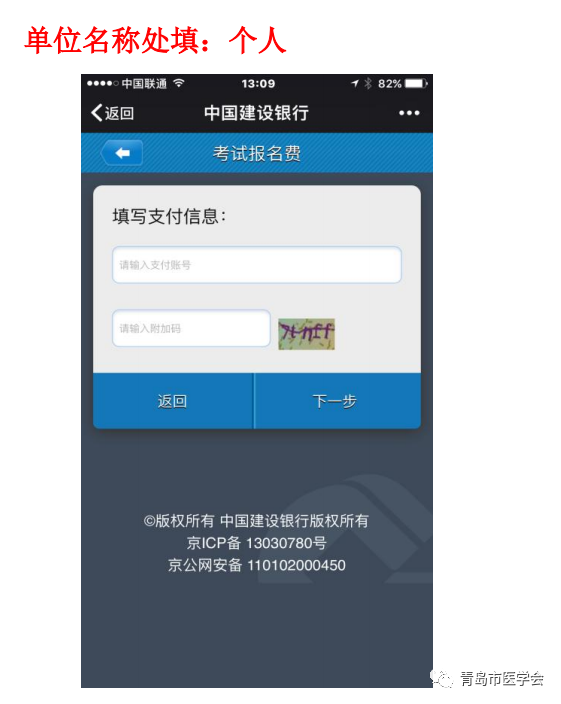 登錄建行官方網(wǎng)站悅生活平臺http://life.ccb.com,選擇“悅享生活”→“悅生活”→“應(yīng)用服務(wù)”→“教育服務(wù)”→“考試報名費”→“山東省-青島市-國家醫(yī)師資格考試費” →下一步→根據(jù)頁面提示,輸入身份證號、姓名→下一步→核對支付信息→“確認”→輸入建行帳號等信息,完成支付。