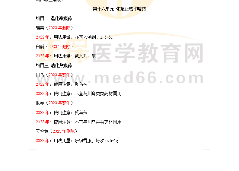 2023中西醫(yī)內科主治醫(yī)師考試《中藥學》教材公布了,經(jīng)醫(yī)學教育網(wǎng)專業(yè)人員校對,發(fā)現(xiàn)如下變化內容: