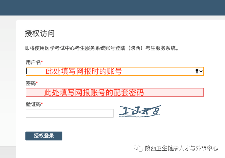 2.頁(yè)面自動(dòng)跳轉(zhuǎn)至國(guó)家醫(yī)學(xué)考試(陜西)考生服務(wù)系統(tǒng),考生使用考試報(bào)名系統(tǒng)的賬號(hào)進(jìn)行授權(quán),授權(quán)完成后即可進(jìn)入報(bào)名材料上傳界面。