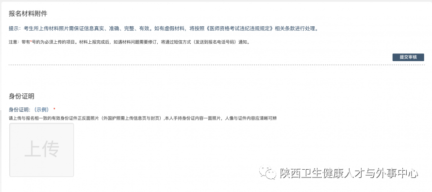 進(jìn)入國(guó)家醫(yī)學(xué)考試(陜西)考生服務(wù)系統(tǒng)(在線審核系統(tǒng))后,顯示的是材料上傳界面