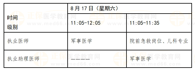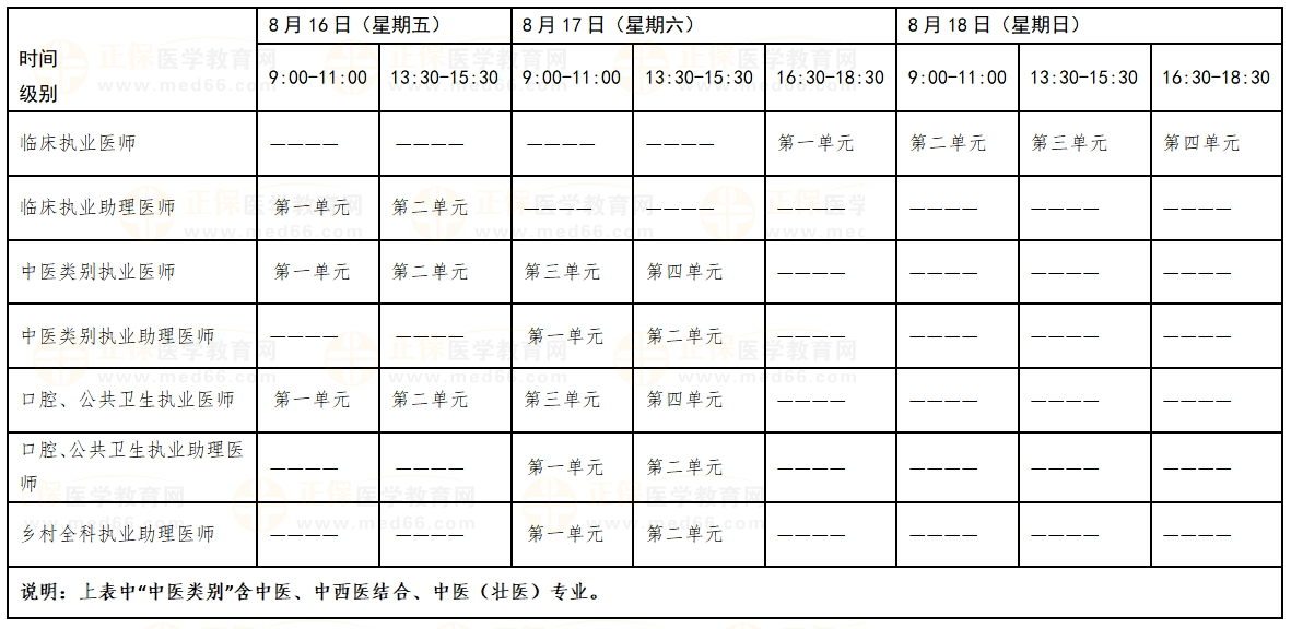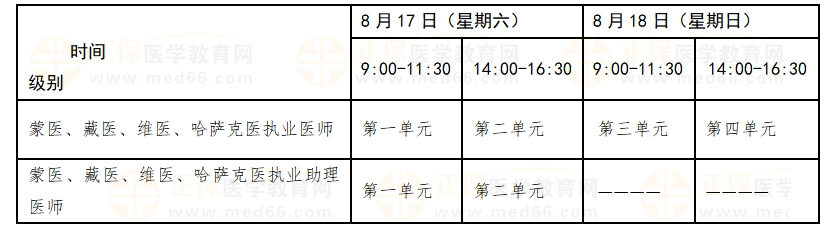 考試實(shí)行計(jì)算機(jī)化考試,軍隊(duì)現(xiàn)役人員加試軍事醫(yī)學(xué)、院前急救崗位和兒科專業(yè)加試相應(yīng)內(nèi)容。中醫(yī)類別蒙醫(yī)、藏醫(yī)、維醫(yī)、哈薩克醫(yī)專業(yè)實(shí)行紙筆考試。統(tǒng)一考試時(shí)間如下: