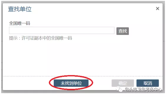 在本單位醫(yī)療機構(gòu)執(zhí)業(yè)許可證副本中找到“全國唯一碼”,輸入后進行查找,若提示未找到醫(yī)療機構(gòu),請點擊下方“未找到單位”