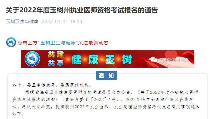 關(guān)于2022年度玉樹(shù)州執(zhí)業(yè)醫(yī)師資格考試報(bào)名的通告