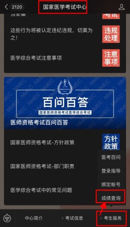 開通成績查詢服務(wù)后,國家醫(yī)學(xué)考試中心將及時主動向已經(jīng)關(guān)注并綁定“國家醫(yī)學(xué)考試中心”公眾號(NMEC1985)的考生推送醫(yī)學(xué)綜合考試的考試成績,具體綁定流程請查看公眾號內(nèi)“考生服務(wù)-綁定賬號”說明。