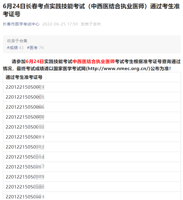 6月24日長春考點實踐技能考試(中西醫(yī)結(jié)合執(zhí)業(yè)醫(yī)師)通過考生準考證號