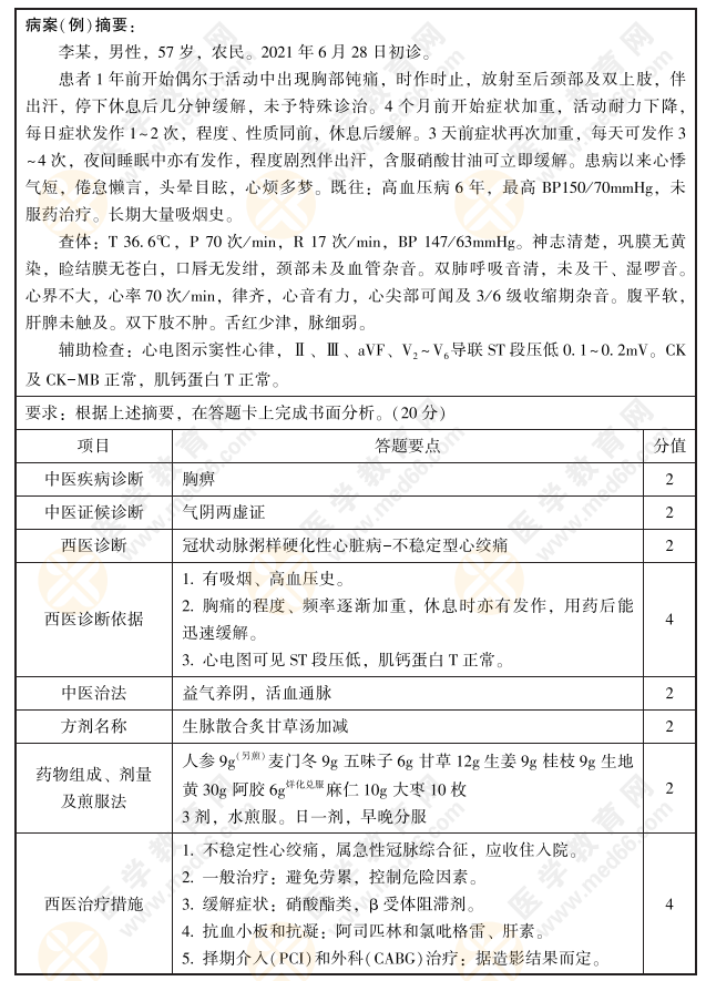 2022年中西醫(yī)執(zhí)業(yè)醫(yī)師實(shí)踐技能第一站【病例分析】練習(xí)題2號(hào):胸痹