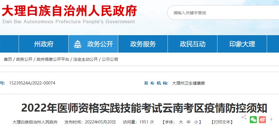 云南考區(qū)大理白族自治州考點(diǎn)2022年中西醫(yī)執(zhí)業(yè)醫(yī)師實(shí)踐技能考試疫情防控須知