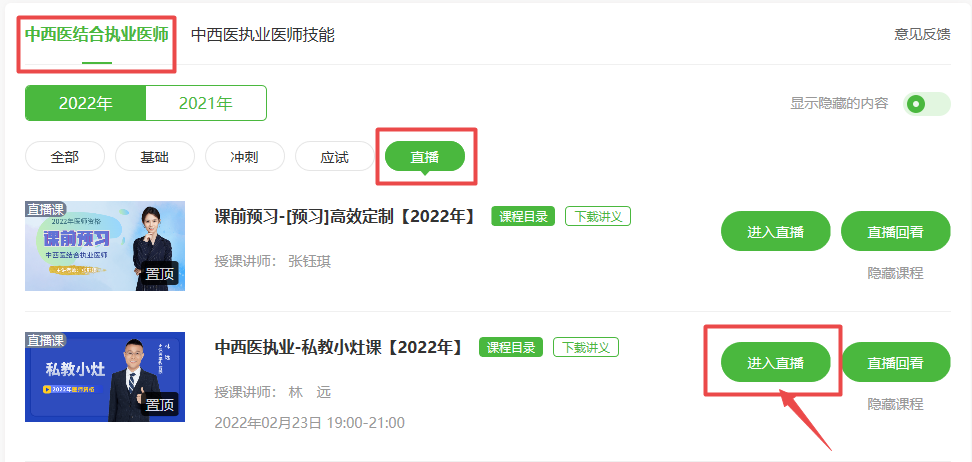從醫(yī)學教育網首頁進入“我的網校我的家”-“我的課程”-“進入學習”-“直播”-預習進階,直播前開放直播入口;