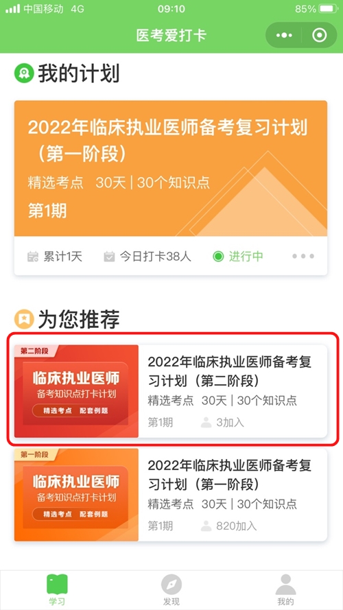 如中西醫(yī)執(zhí)業(yè)醫(yī)師備考復(fù)習(xí)計(jì)劃(第五階段),然后點(diǎn)擊下方“加入計(jì)劃 開始學(xué)習(xí)”按鈕,開始正式進(jìn)入打卡學(xué)習(xí)。