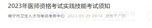 廣西考區(qū)南寧考點(diǎn)2023年醫(yī)師資格考試實(shí)踐技能考試須知已發(fā)布,各類別考生嚴(yán)格按照準(zhǔn)考證考試安排參加考試,詳細(xì)考試基地及考前注意事項(xiàng)詳見通知: