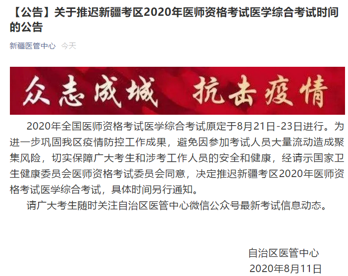 2020年醫(yī)師資格筆試考試新疆考區(qū)確定推遲!具體考試時(shí)間,另行通知?。ㄒ韵聢D片來源于醫(yī)學(xué)教育網(wǎng)社群,由社群學(xué)員提供,目前暫未在官方網(wǎng)站查到該通知?。?/p>