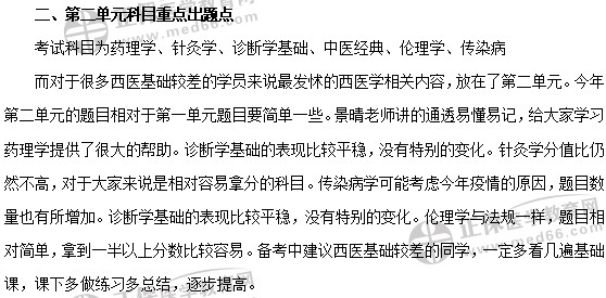 第一單元:中西醫(yī)基礎(chǔ)理論、中西醫(yī)診斷學(xué)、中藥學(xué)、傳染病學(xué)、藥理學(xué)、中醫(yī)經(jīng)典。