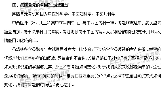 第四單元:中西醫(yī)婦科學(xué)、中西醫(yī)兒科學(xué)、針灸學(xué)。