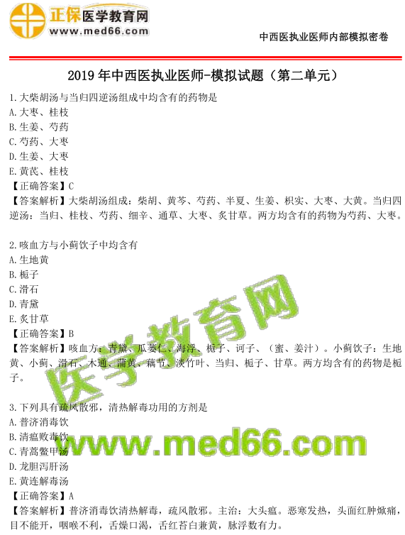 為了幫助2019年中西醫(yī)執(zhí)業(yè)醫(yī)師資格考試的考生及時(shí)的掌握命題規(guī)律,網(wǎng)校特由專業(yè)教學(xué)團(tuán)隊(duì)選取歷年具有代表性的試題組卷(綜合考慮了各科分值占比及難易度情況),對(duì)廣大考生進(jìn)行免費(fèi)實(shí)戰(zhàn)??荚u(píng)測(cè),幫助考生清楚自己的復(fù)習(xí)效果,現(xiàn)階段模擬試卷已經(jīng)在學(xué)習(xí)群為各位學(xué)員免費(fèi)發(fā)放,還有部分考生沒有下載到試卷,小編為大家整理了PDF版本,供各位學(xué)習(xí),以下為第二單元150題答案及解析: