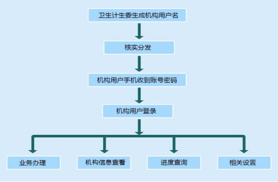 由核發(fā)該機構(gòu)的醫(yī)療機構(gòu)執(zhí)業(yè)許可證的衛(wèi)生計生行政部門(含中醫(yī)局)生成該醫(yī)療機構(gòu)的用戶名和密碼,醫(yī)療機構(gòu)相關(guān)負(fù)責(zé)人攜帶醫(yī)療機構(gòu)執(zhí)業(yè)許可證副本原件及復(fù)印件、醫(yī)療機構(gòu)授權(quán)委托書、受委托人身份證原件及復(fù)印件到衛(wèi)生計生行政部門(含中醫(yī)局)領(lǐng)取用戶名和密碼,經(jīng)衛(wèi)生計生行政部門(含中醫(yī)局)分發(fā)人員現(xiàn)場核實后,用戶名和密碼可直接發(fā)送到醫(yī)療機構(gòu)相關(guān)負(fù)責(zé)人手機中,醫(yī)療機構(gòu)負(fù)責(zé)人可憑此密碼登錄醫(yī)療機構(gòu)端。