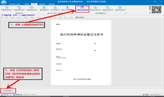 l 在圖中單擊【注銷申請書打印】按鈕,進(jìn)入“注銷申請書打印”窗口。點擊打印空白表可以打印機構(gòu)注銷申請空白表。如圖所示:
