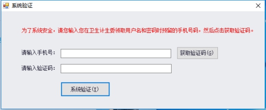 若您的電腦為第一次啟動本系統(tǒng),則需要驗證您的用戶信息。請輸入您在衛(wèi)生計生委領(lǐng)取用戶名和密碼時預(yù)留的手機號碼,收到驗證碼后,輸入即可驗證成功。