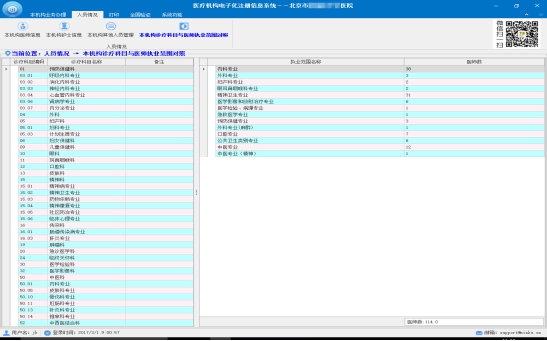 l 此功能可以查看本機構(gòu)的診療科目信息,并且可以統(tǒng)計各執(zhí)業(yè)范圍下注冊的醫(yī)師數(shù)。
