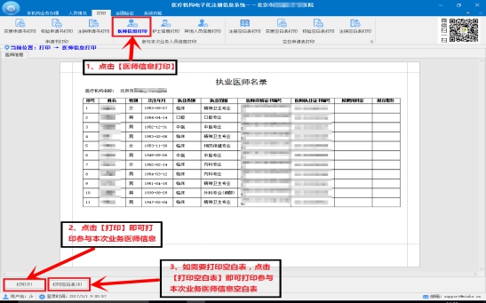l 在圖中單擊【醫(yī)師信息打印】按鈕,進(jìn)入“醫(yī)師信息打印”窗口。注:點擊打印空白表可以打印醫(yī)師信息空白表。如圖所示: