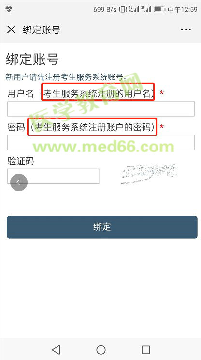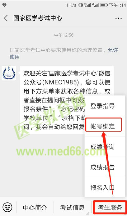 完成注冊后,關(guān)注微信公眾號“國家醫(yī)學(xué)考試中心”—>點(diǎn)擊“考生服務(wù)”菜單,找到“綁定帳號”—>會跳轉(zhuǎn)到“綁定賬號”頁面,輸入國家醫(yī)學(xué)考試考生服務(wù)系統(tǒng)帳號(用戶名)及密碼進(jìn)行綁定即可。如果已經(jīng)進(jìn)行過綁定的用戶則會直接跳轉(zhuǎn)到“綁定成功”頁面。