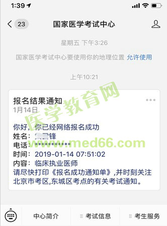 考生在“國家醫(yī)學(xué)考試考生服務(wù)系統(tǒng)”中完成當(dāng)年的考試信息填報(bào),并成功提交之后,考生手機(jī)微信中的“國家醫(yī)學(xué)考試中心”公眾號收到“報(bào)名結(jié)果通知”,示例如下圖: