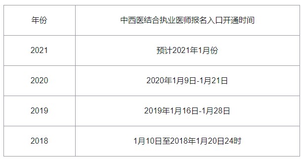 大家也可以參考往年中西醫(yī)結(jié)合執(zhí)業(yè)醫(yī)師考試報名入口開通時間: