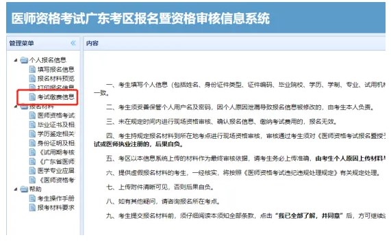 一、考生登錄“醫(yī)師資格考試廣東考區(qū)報(bào)名暨資格審核信息系統(tǒng)”(https://jy.gdwsrc.net/),點(diǎn)擊“考試?yán)U費(fèi)信息”查看需繳費(fèi)信息。