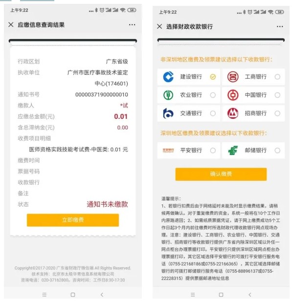 五、微信掃碼后,點(diǎn)擊“立即繳費(fèi)”,選擇“財(cái)政收款銀行”,注意區(qū)分非深圳地區(qū)和深圳地區(qū)。認(rèn)真閱讀“溫馨提示”。