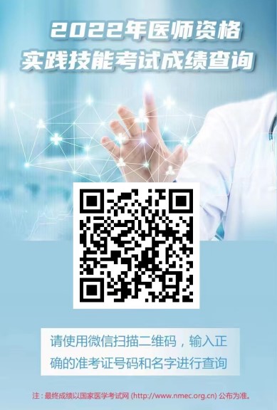 根據(jù)國家醫(yī)師資格考試工作要求,江西考區(qū)九江考點(diǎn)于6月23日開通2022年醫(yī)師資格實(shí)踐技能考試成績考生查詢端口(微信掃描下方二維碼或者長按手機(jī)屏幕選擇“識別圖中二維碼”進(jìn)入)。最終成績以國家醫(yī)學(xué)考試網(wǎng)公布()為準(zhǔn)。