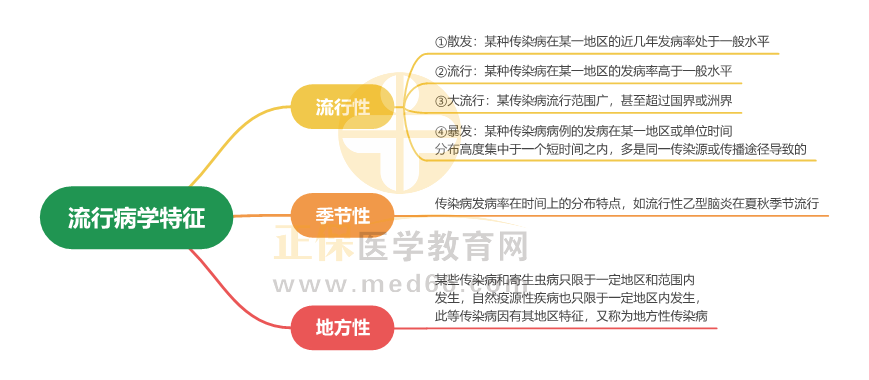 2024年中西醫(yī)助理醫(yī)師考試中,傳染病學考面廣、考點細,不容易抓住,但是內容簡單、基礎,主要出題點有治療(藥物的使用和治療原則)、流行病學(傳染源、傳播途徑)、癥狀(部位)等。醫(yī)學教育網(wǎng)小編為大家整理“流行病學特征”考點思維導圖供大家復習: