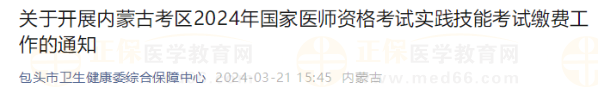 內蒙古考區(qū)2024年國家醫(yī)師資格考試實踐技能考試繳費時間為4月1日——7日24:00,請參加考試的考生按時在國家醫(yī)學考試網考試服務入口繳納考試費用,逾期未繳費者,視為放棄考試資格。