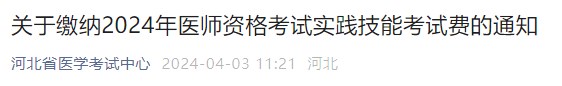 2024年河北考區(qū)醫(yī)師資格考試實踐技能考試繳費工作已經(jīng)開始,請考生于4月3日14:00-4月11日24:00前登錄國家醫(yī)學(xué)考試網(wǎng),繳納實踐技能考試費。