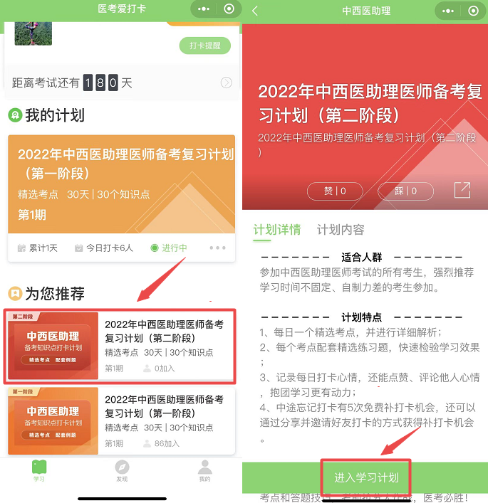 第三步:選擇備考科目后即進(jìn)入學(xué)習(xí)計(jì)劃選擇的頁(yè)面,請(qǐng)選擇“您的備考計(jì)劃”,如中西醫(yī)執(zhí)業(yè)助理醫(yī)師備考復(fù)習(xí)計(jì)劃(第二階段),然后點(diǎn)擊下方“進(jìn)入學(xué)習(xí)計(jì)劃”按鈕,開始正式進(jìn)入打卡學(xué)習(xí)。