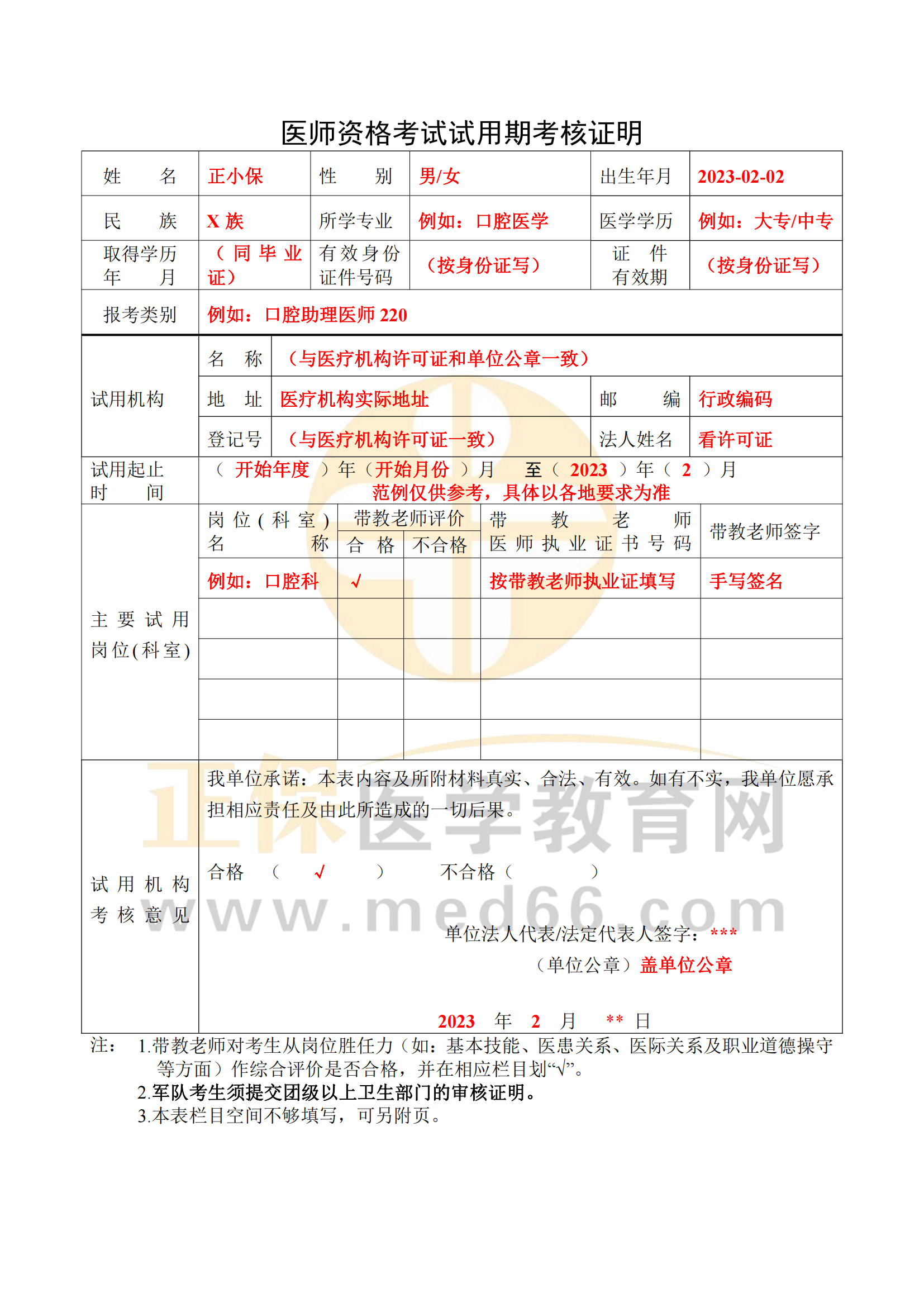 醫(yī)師資格考試試用期考核證明(2023版)填寫范例_00