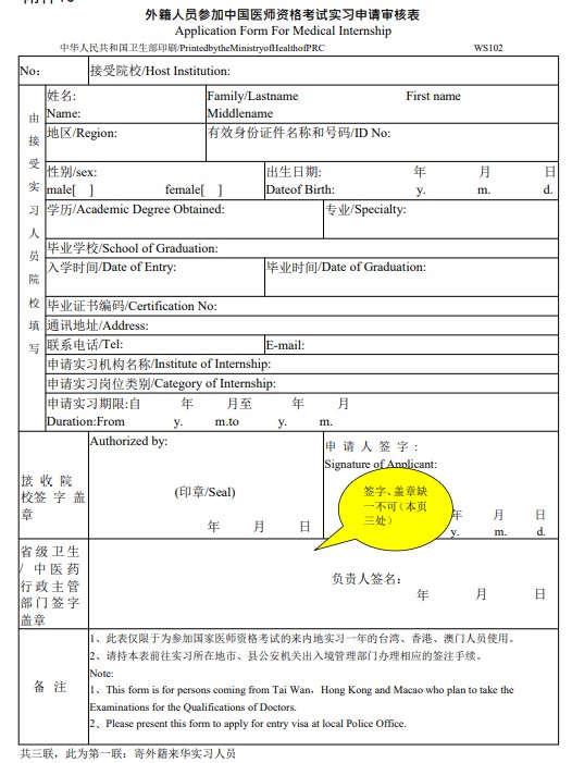 以上分享的“2023版外籍人員參加中國醫(yī)師資格考試實(shí)習(xí)申請(qǐng)審核表填寫范例”內(nèi)容,由醫(yī)學(xué)教育網(wǎng)小編搜集整理,如果您覺得對(duì)您有所幫助,可以分享給朋友。想了解更多醫(yī)學(xué)考試報(bào)名審核信息、復(fù)習(xí)資料、備考干貨請(qǐng)關(guān)注醫(yī)學(xué)教育網(wǎng)。